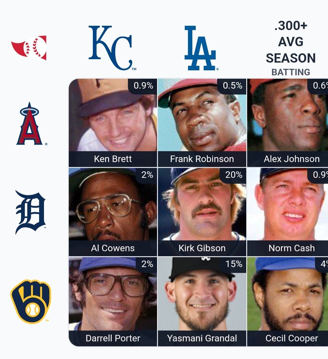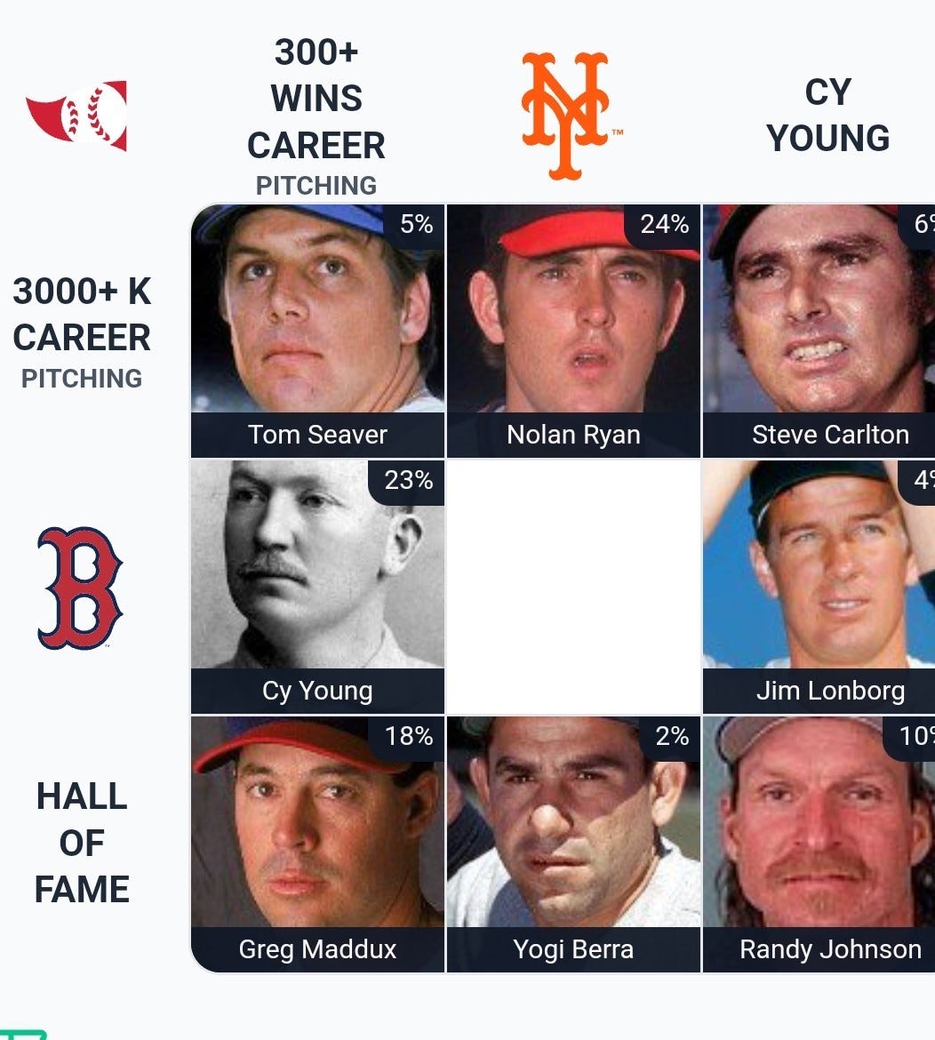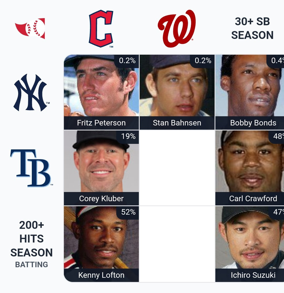 On that fateful day, the only grid was for Major League Baseball. There were three columns down and three columns across—mostly team logos with one feat (I don’t recall if it was a 20-game winner or a .300 batter or whatever) sprinkled in. For each of the nine squares of the grid, the challenge is to name players from across MLB history who are in each of those intersections.