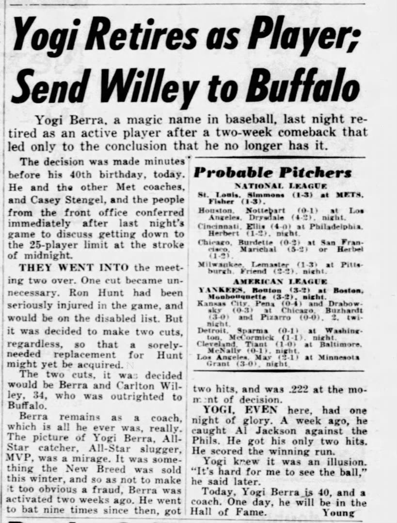 And who knew Yogi Berra (see below) played for the New York Mets? (After 18 seasons with the New York Yankees, Berra tried a comeback spanning only four games with the Mets in ‘65.) I knew it—only a week earlier, I had dug up clips to learn more about this closing chapter in his career.