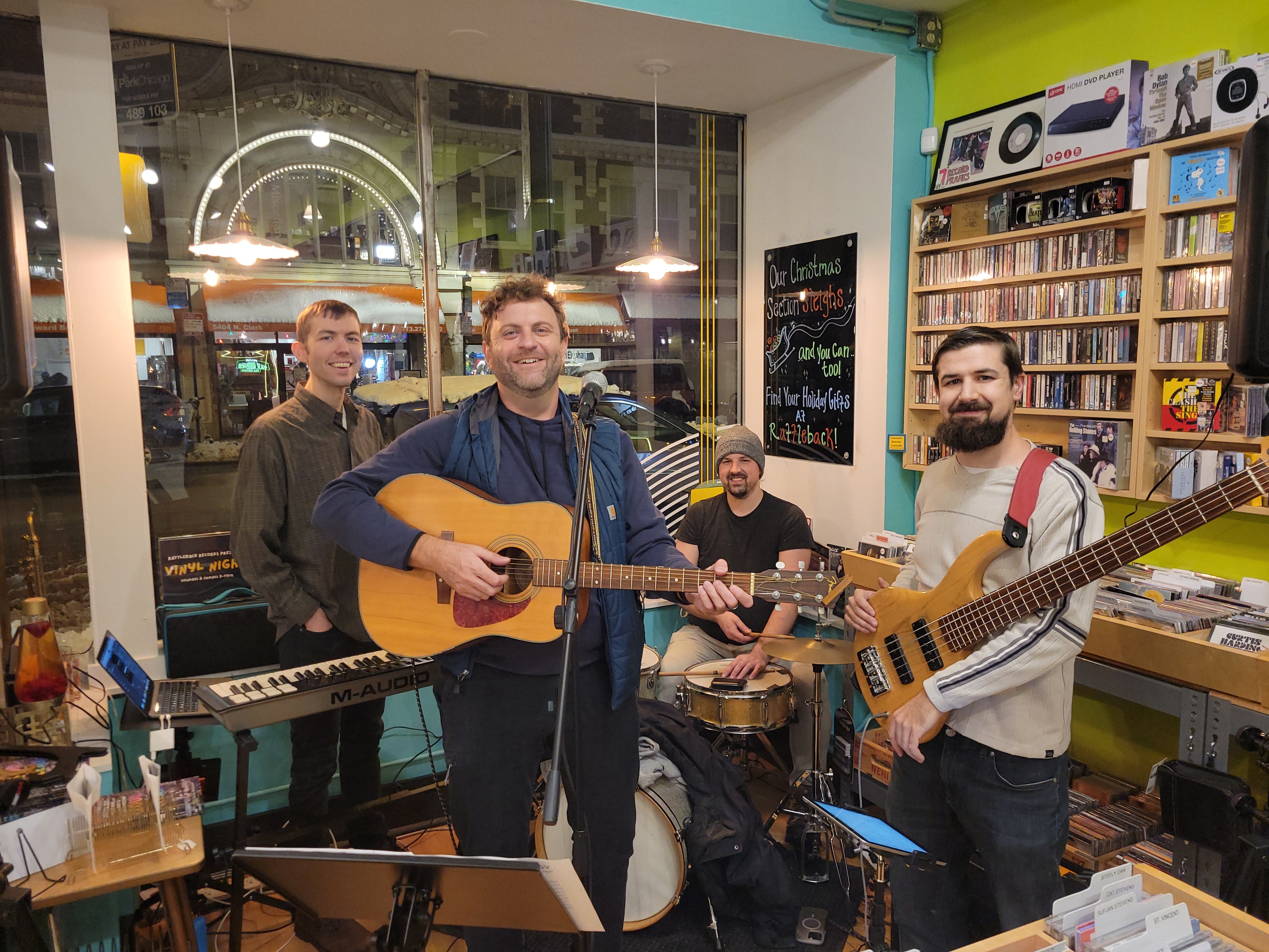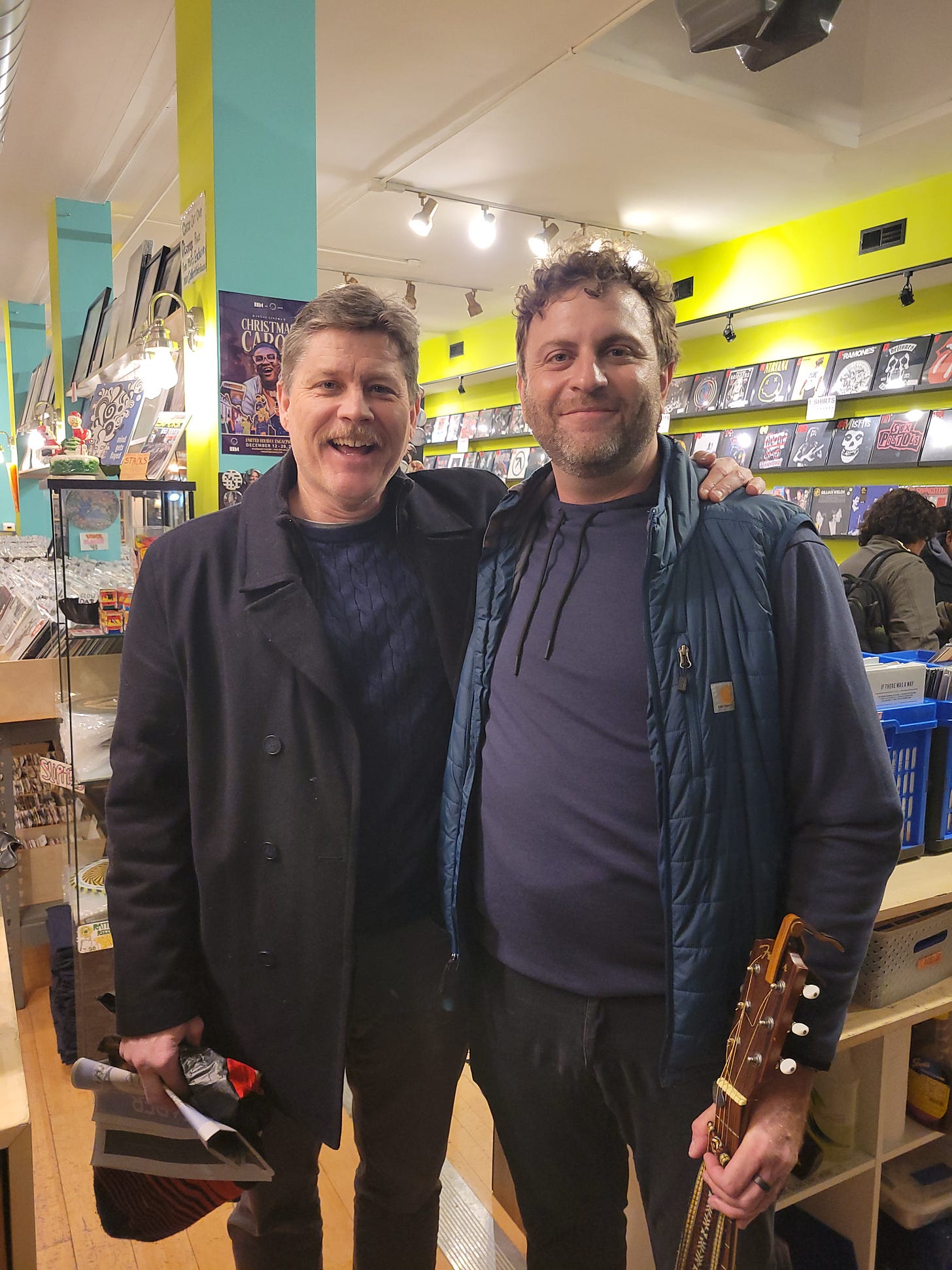 Trudging in from Clark Street’s sidewalk snow and slush, I caught a glimpse of Matt through the storefront window, then opened the door to Rattleback Records. A few steps inside and a few minutes shy of their appointed time to play, he was adjusting his guitar and microphone.